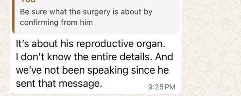 Bro Gbenga, this message came days after we had an honest conversation about ourselves and the future. Meanwhile, he had a surgery during the time, though he didn’t say what type, but I could guess. I could guess because in one of the nights, while he was still at the hospital, he showed me his pENIS and to be honest, it looked fragile. I showed him pant and bumbum too plus breast. It was a romantic and honest moment for us.
