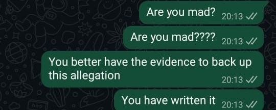 "We have called our lawyers and gotten the police involved. We will be waiting for you at the Ikeja Police Station by 2 pm today. We have the evidence of all the financial transactions between the two of you, and i will